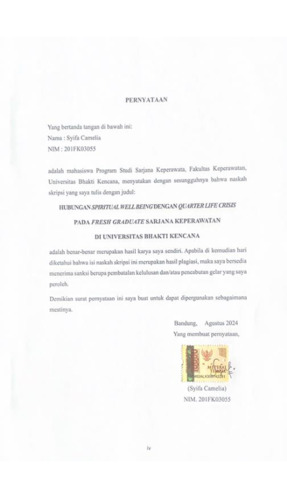 krisis emosional seperti disorientasi, frustrasi, panik, khawatir dan tidak tahu arah. Spiritual well being menjadi salah satu faktor yang berhubungan dengan quarter life crisis. Penelitian ini bertujuan untuk mengetahui adanya hubungan spiritual well being dengan quarter life crisis pada fresh graduate sarjana Keperawatan di Universitas Bhakti Kencana. Metode: penelitian kuantitatif dengan Teknik