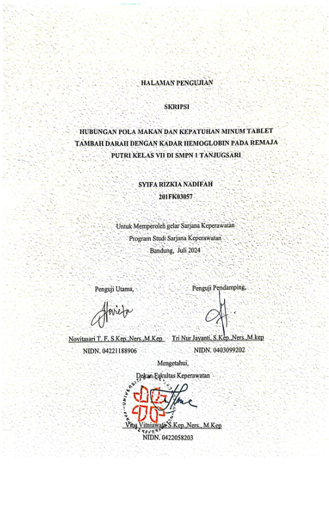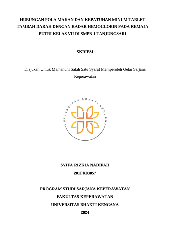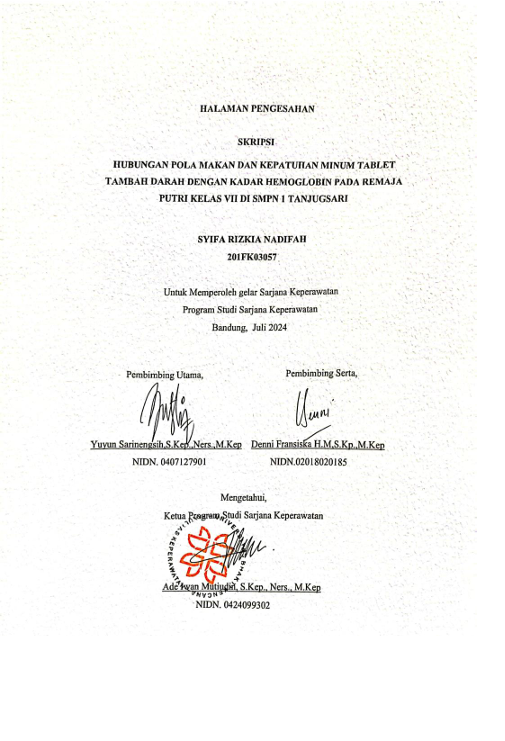 Rizkia Nadifah, Syifa (2024) Hubungan Pola Makan dan Kepatuhan Minum Tablet Tambah Darah dengan Kadar Hemoglobin pada Remaja Putri Kelas VII di SMPN 1 Tanjungsari. Other thesis, Universitas Bhakti Kencana.