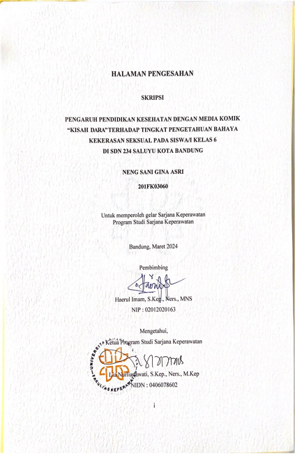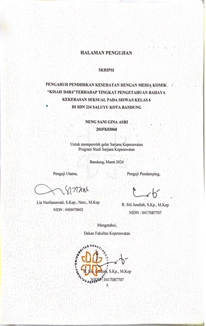 Sani Gina Asri, Neng (2024) Pengaruh Pendidikan Kesehatan dengan Media Komik "Kisah Dara" Terhadap Tingkat Pengetahuan Bahaya Kekerasan Seksual pada Siswa/I Kelas 6 di SDN 234 Saluyu Kota Bandung. Other thesis, Universitas Bhakti Kencana.