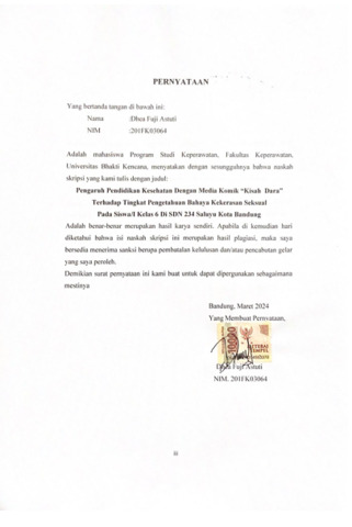 seksual tidak hanya menerangkan aspek – aspek anatomi dan biologis juga menerangkan aspek – aspek psikologis dan moral serta penjagaan diri dari orang yang berniat buruk. Tujuan pada penelitian ini untuk menganalisis pengaruh pemberian komik “Kisah Dara” terdahap tingkat pengetahuan bahaya kekerasan seksual padasiswa/siswi kelas 6 SDN 234 Saluyu.