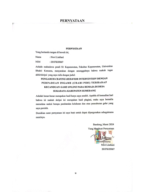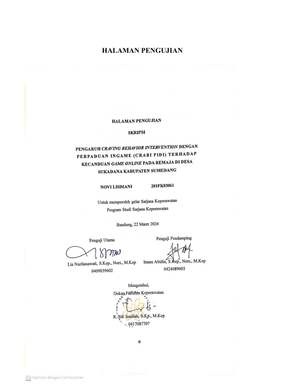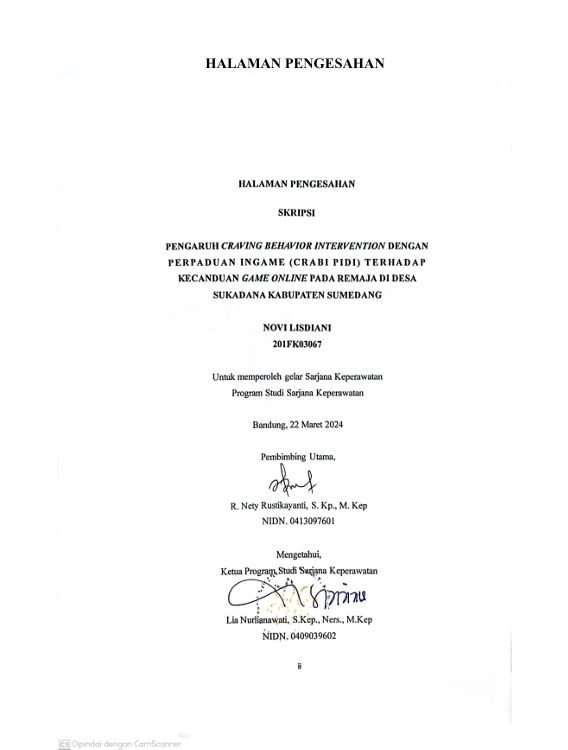 Lisdiani, Novi (2024) Pengaruh Craving Behavior Intervention dengan Perpaduan Ingame (Crabi Pidi) Terhadap Kecanduan Game Online pada Remaja di Desa Sukadana Kabupaten Sumedang. Other thesis, Universitas Bhakti Kencana.