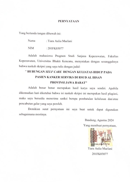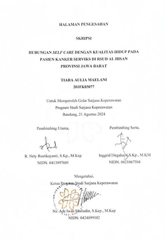 Aulia Maelani, Tiara (2024) Hubungan Self Care dengan Kualitas Hidup pada Pasien Kanker Serviks di RSUD Al Ihsan Provinsi Jawa Barat. Other thesis, Universitas Bhakti Kencana.