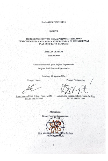 Lestari, Amelia (2024) Hubungan Motivasi Kerja Perawat Terhadap Pendokumentasian Asuhan Keperawatan di Ruang Rawat Inap RSUD Kota Bandung. Other thesis, Universitas Bhakti Kencana.