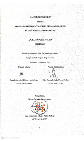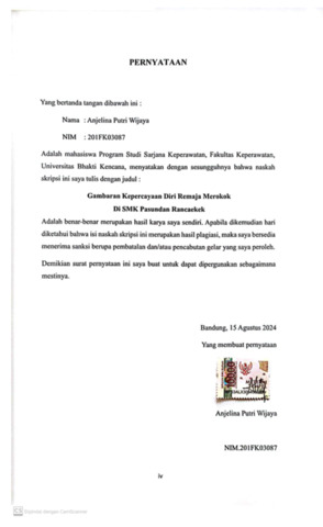 Putri Wijaya, Anjelina (2024) Gambaran Kepercayaan Diri Remaja Merokok di SMK Pasundan Rancaekek. Other thesis, Universitas Bhakti Kencana.