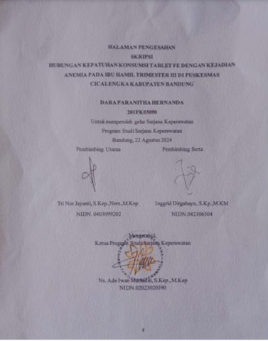 Paranitha Hernanda, Dara (2024) Hubungan Kepatuhan Konsumsi Tablet FE dengan Kejadian Anemia pada Ibu Hamil Trimester III di Puskesmas Cicalengka Kabupaten Bandung Tahun 2024. Other thesis, Universitas Bhakti Kencana.