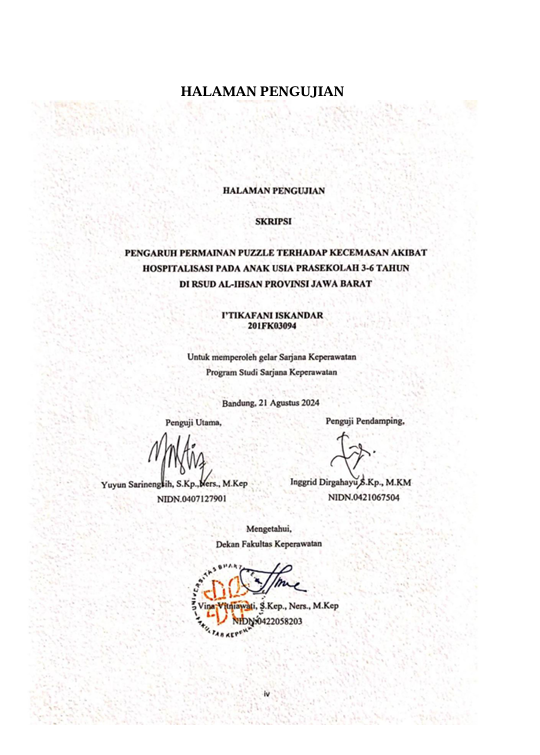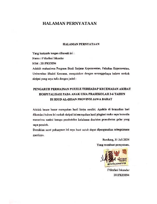 Iskandar, I’tikafani (2024) Pengaruh Permainan Puzzle Terhadap Kecemasan Akibat Hospitalisasi pada Anak Usia Prasekolah 3-6 Tahun di RSUD Al Ihsan Provinsi Jawa Barat. Other thesis, Universitas Bhakti Kencana.