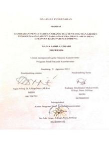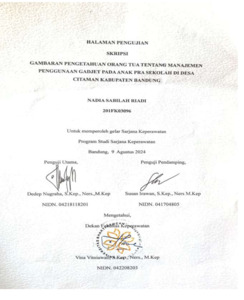 Sabilah Riadi, Nadia (2024) Gambaran Pengetahuan Orangtua Tentang Manajemen Penggunaan Gadget pada Anak Pra Sekolah di Desa Citaman Kabupaten Bandung. Other thesis, Universitas Bhakti Kencana.