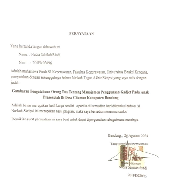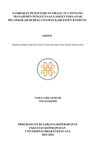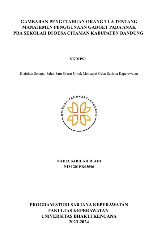 Sabilah Riadi, Nadia (2024) Gambaran Pengetahuan Orangtua Tentang Manajemen Penggunaan Gadget pada Anak Pra Sekolah di Desa Citaman Kabupaten Bandung. Other thesis, Universitas Bhakti Kencana.