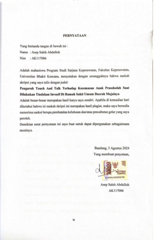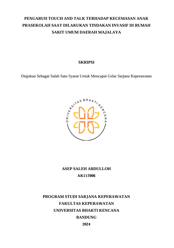 Saleh Abdulloh, Asep (2024) Pengaruh Touch and Talk Terhadap Kecemasan Anak Prasekolah Saat Dilakukan Tindakan Invasif di Rumah Sakit Umum Daerah Majalaya. Other thesis, Universitas Bhakti Kencana.