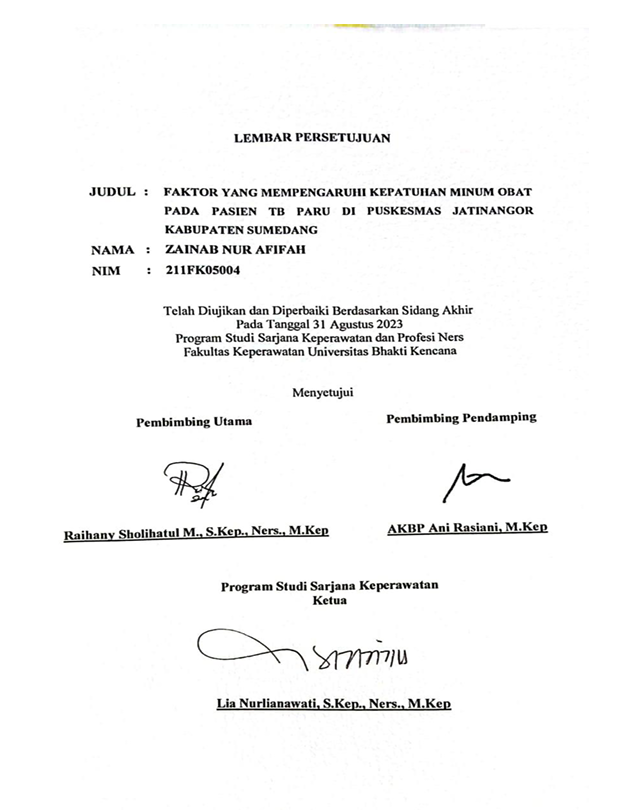 Nur Afifah, Zainab (2023) Analisis Faktor yang Mempengaruhi Kepatuhan Minum Obat pada Pasien TB Paru di Puskesmas Jatinangor Kabupaten Sumedang. Other thesis, Universitas Bhakti Kencana.