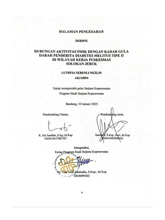 Serenli Nezlin, Luthfia (2024) Huungan Aktivitas Fisik dengan Kadar Gula Darah Penderita Diabetes Melitus Tipe II di Wilayah Kerja Puskesmas Solokan Jeruk. Other thesis, Universitas Bhakti Kencana.