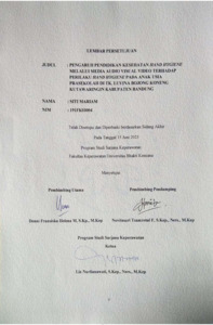 Mariam, Siti (2023) Pengaruh Pendidikan Kesehatan Hand Hygiene Melalui Media Audio Visual Video Terhadap Perilaku Hand Hygiene pada Anak Usia Prasekolah di TK Luvina Bojong Koneng Kutawaringin Kabupaten Bandung. Other thesis, Universitas Bhakti Kencana.