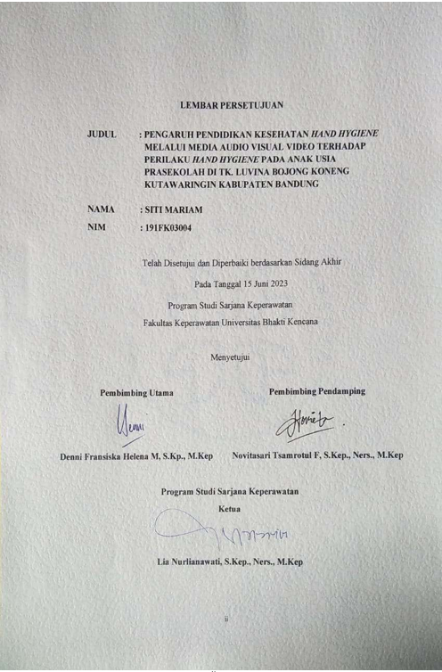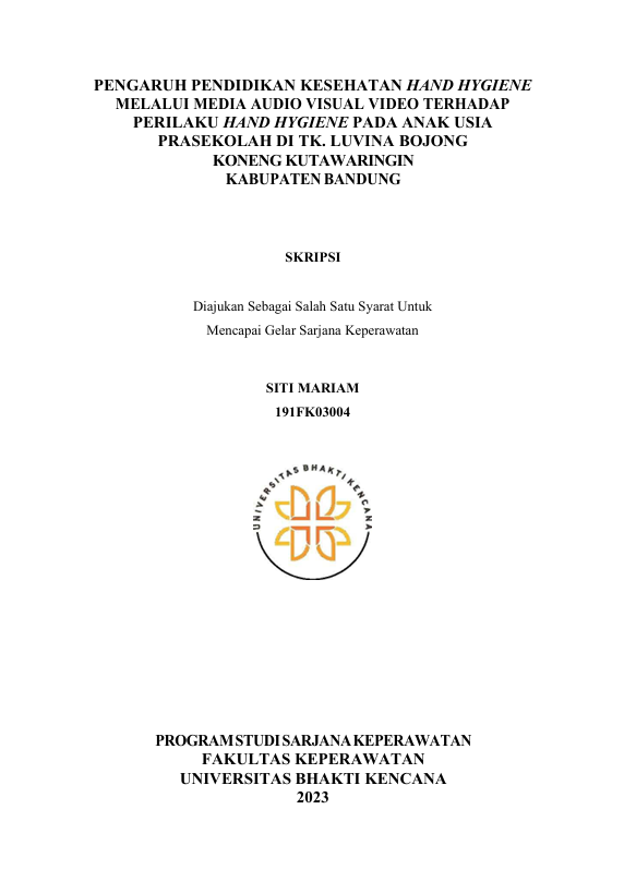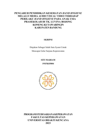 Mariam, Siti (2023) Pengaruh Pendidikan Kesehatan Hand Hygiene Melalui Media Audio Visual Video Terhadap Perilaku Hand Hygiene pada Anak Usia Prasekolah di TK Luvina Bojong Koneng Kutawaringin Kabupaten Bandung. Other thesis, Universitas Bhakti Kencana.
