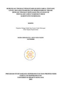Rihadatul Aisyi Nur Faizin, Raida (2023) Hubungan Tingkat Pengetahuan Keluarga Tentang Level Kegawatdaruratan Berdasarkan Triase dengan Tingkat Kepuasan Pelayanan di Instalasi Gawat Darurat RSUD Kabupaten Sumedang. Other thesis, Universitas Bhakti Kencana.