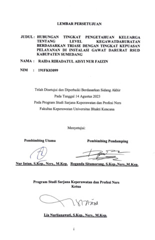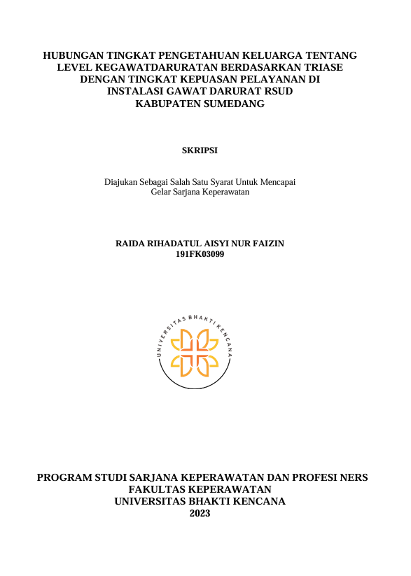 Rihadatul Aisyi Nur Faizin, Raida (2023) Hubungan Tingkat Pengetahuan Keluarga Tentang Level Kegawatdaruratan Berdasarkan Triase dengan Tingkat Kepuasan Pelayanan di Instalasi Gawat Darurat RSUD Kabupaten Sumedang. Other thesis, Universitas Bhakti Kencana.