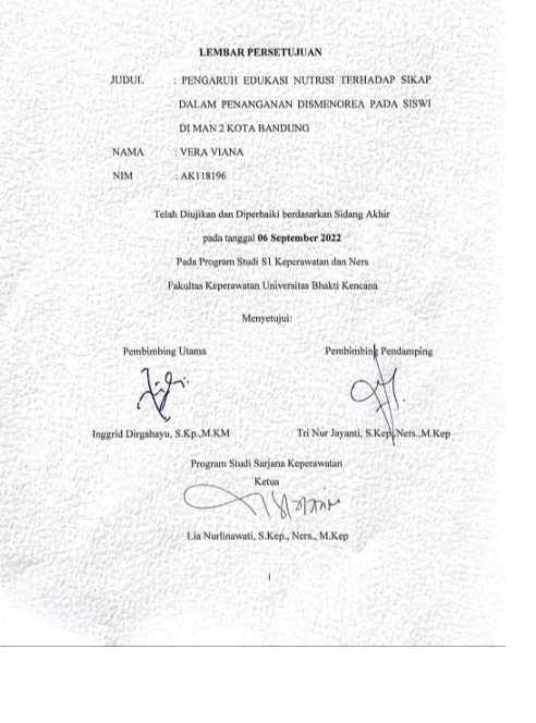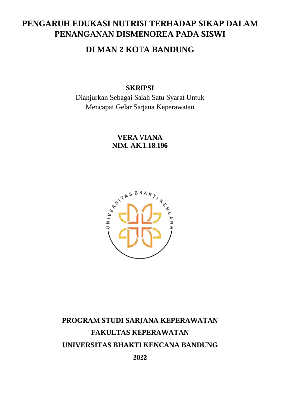 Viana, Vera (2022) Pengaruh Edukasi Nutrisi Terhadap Sikap Dalam Penanganan Dismenorea pada Siswi di MAN 2 Kota Bandung. Other thesis, Universitas Bhakti Kencana.