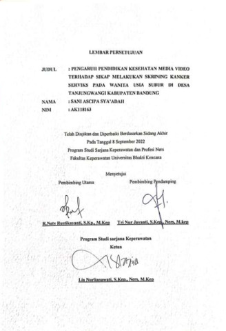 Ascipa Sya’adah, Sani (2022) Pengaruh Pendidikan Kesehatan Media Video Terhadap Sikap Melakukan Skrining Kanker Serviks pada Wanita Usia Subur di Desa Tanjungwangi Kabupaten Bandung. Other thesis, Universitas Bhakti Kencana.