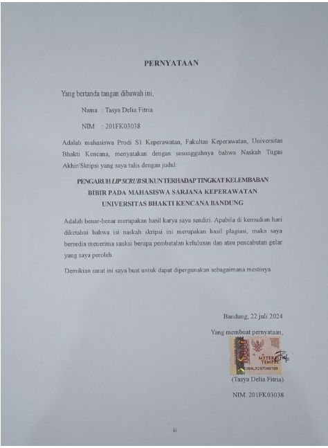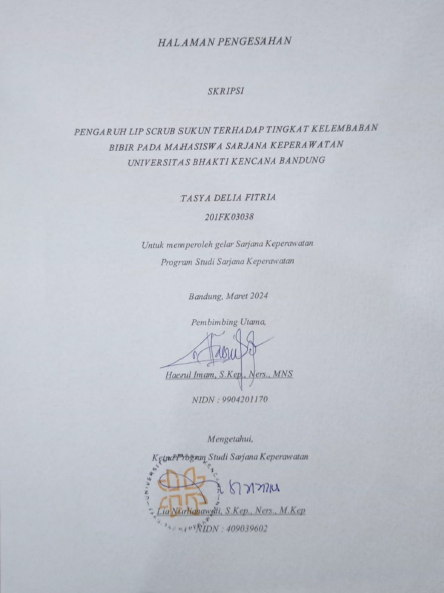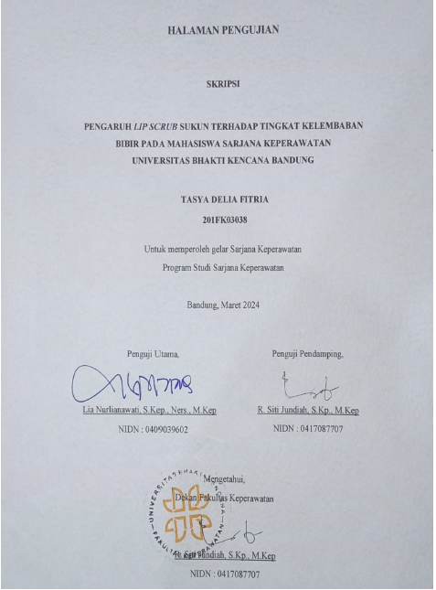 Delia Fitria, Tasya (2024) Pengaruh Lip Scrub Sukun Terhadap Tingkat Kelembaban Bibir pada Mahasiswa Sarjana Keperawatan Universitas Bhakti Kencana Bandung. Other thesis, Universitas Bhakti Kencana.