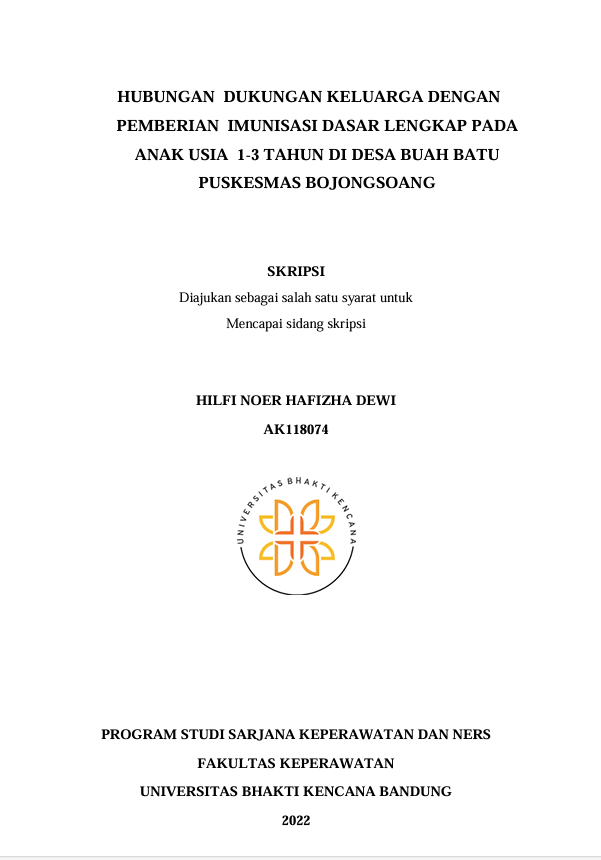 Noer Hafizha Dewi, Hilfi (2022) Hubungan Dukungan Keluarga dengan Pemberian Imunisasi Dasar Lengkap pada Anak Usia 1-3 Tahun di Desa Buah Batu Puskesmas Bojongsoang. Other thesis, Universitas Bhakti Kencana.
