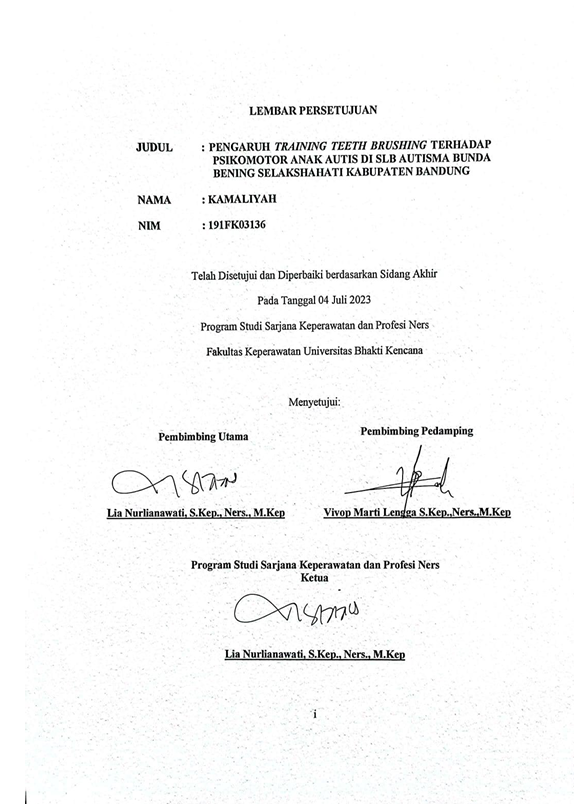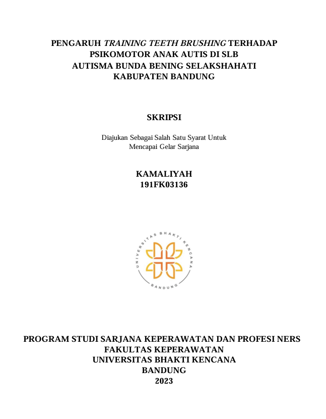 -, Kamaliyah (2023) Pengaruh Training Teeth Brushing Terhadap Psikomotor Anak Autis di SLB Autisma Bunda Bening Selakshahati Kabupaten Bandung. Other thesis, Universitas Bhakti Kencana.