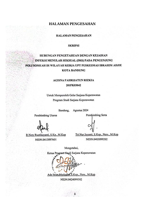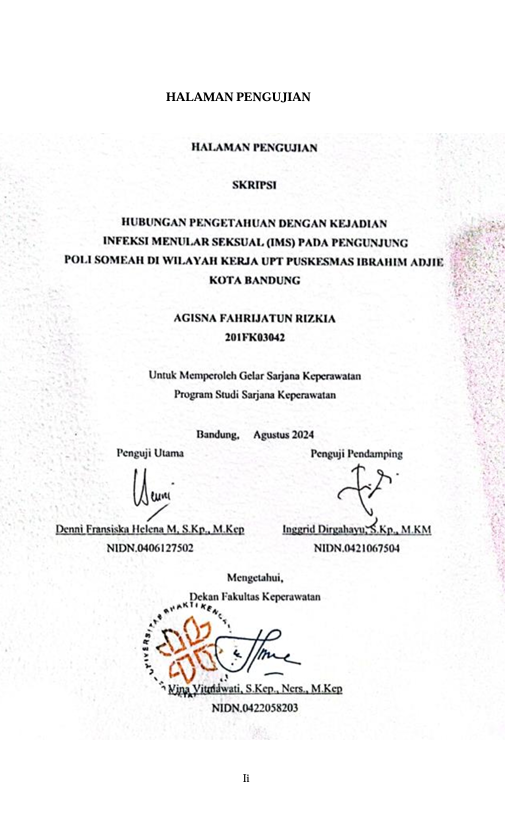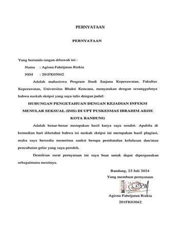 Fahrijatun Rizkia, Agisna (2024) Hubungan Pengetahuan dengan Kejadian Infeksi Menular Seksual (IMS) pada Pengunjung Poli Someah di Wilayah Kerja UPT Puskesmas Ibrahim Adjie Kota Bandung. Other thesis, Universitas Bhakti Kencana.