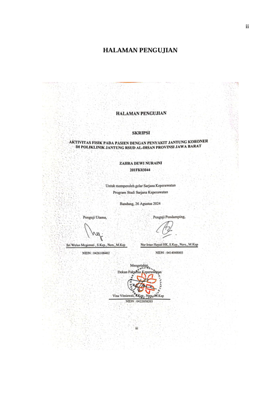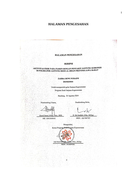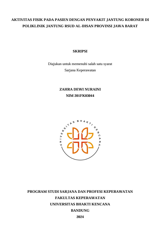Dewi Nuraini, Zahra (2024) Aktivitas Fisik pada Pasien dengan Penyakit Jantung Koroner di Poliklinik Jantung RSUD Al-Ihsan Provinsi Jawa Barat. Other thesis, Universitas Bhakti Kencana.