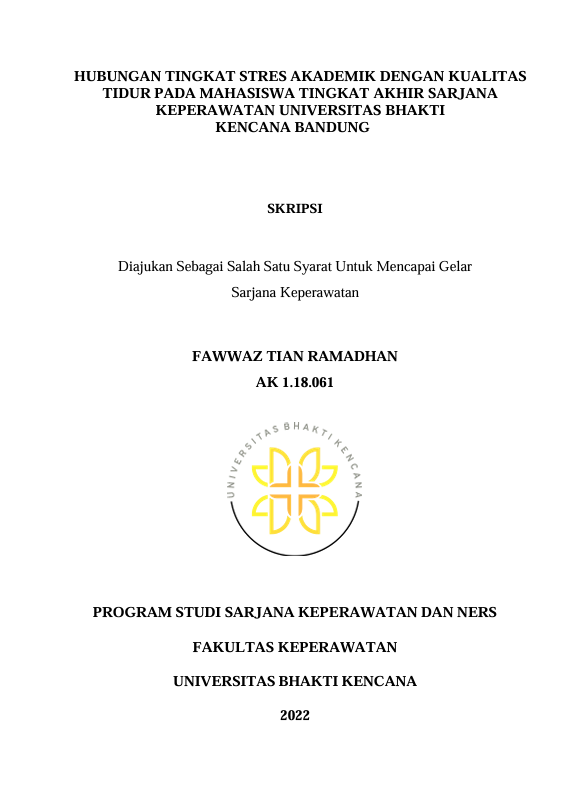 Tian Ramadhan, Fawwaz (2022) Hubungan Tingkat Stress Akademik dengan Kualitas Tidur pada Mahasiswa Tingkat Akhir Sarjana Keperawatan Universitas Bhakti Kencana Bandung. Other thesis, Universitas Bhakti Kencana.