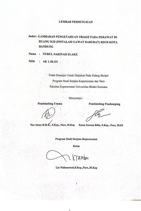 Sakinah Elake, Nurul (2022) Gambaran Pengetahuan Triage pada Perawat di Ruang IGD (Instalasi Gawat Darurat) RSUD Kota Bandung. Other thesis, Universitas Bhakti Kencana.