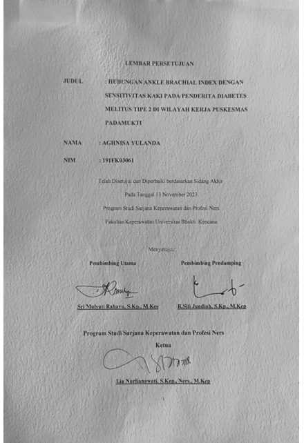 Yulanda, Aghnisa (2023) Hubungan Ankle Brachial Index dengan Sensitivitas Kaki pada Pasien Diabetes Melitus Tipe II di Wilayah Kerja Puskesmas Padamukti. Other thesis, Universitas Bhakti Kencana.