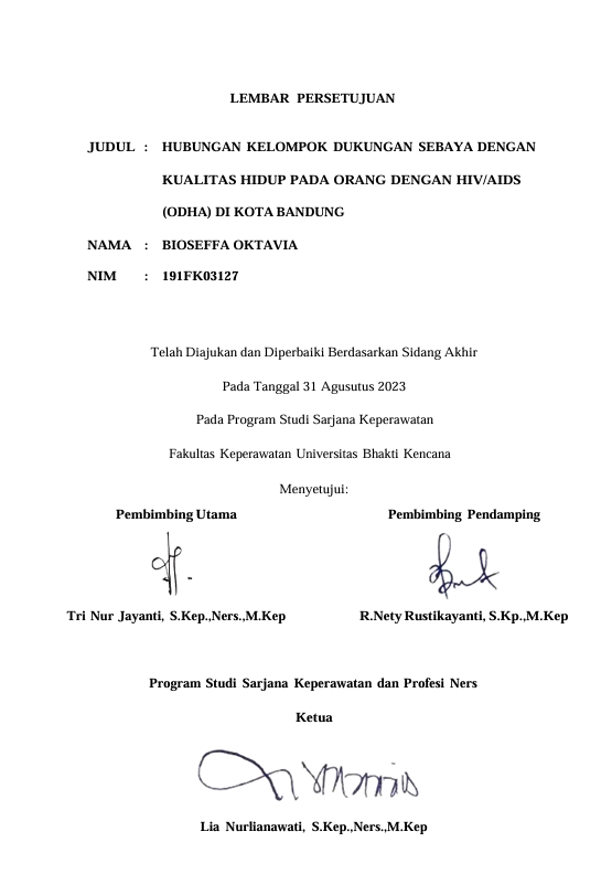Oktavia, Bioseffa (2023) Hubungan Kelompok Dukungan Sebaya dengan Kualitas Hidup pada Orang dengan HIV/AIDS (ODHA) DI Kota Bandung. Other thesis, Universitas Bhakti Kencana.