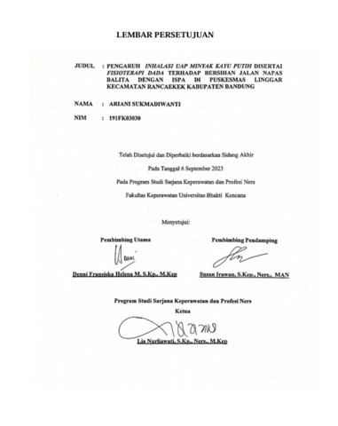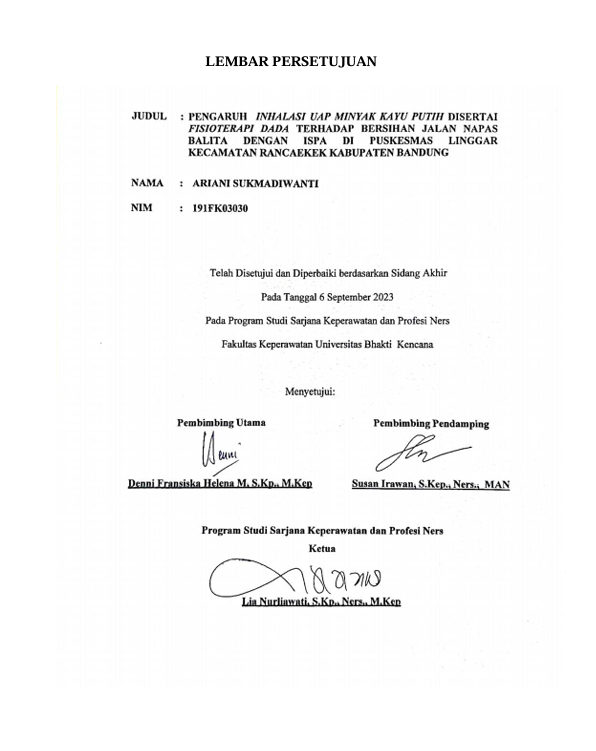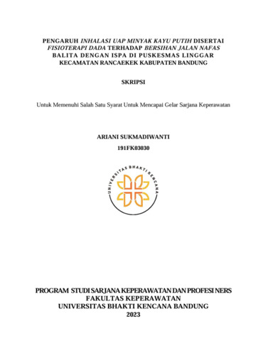 Sukmadiwanti, Ariani (2023) Pengaruh Inhalasi Uap Minyak Kayu Putih Disertai Fisioterapi Dada Terhadap Bersihan Jalan Nafas Balita dengan ISPA di Puskesmas Linggar Kecamatan Rancaekek Kabupaten Bandung. Other thesis, Universitas Bhakti Kencana.